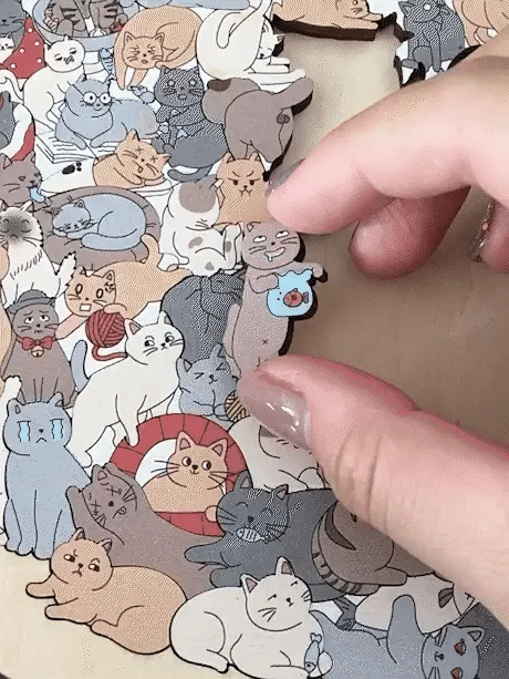 Each puzzle piece has its own shape — some are cat paws, others depict cats in playful or resting poses. Every fit feels precise and satisfying, turning each connection into a small moment of accomplishment.