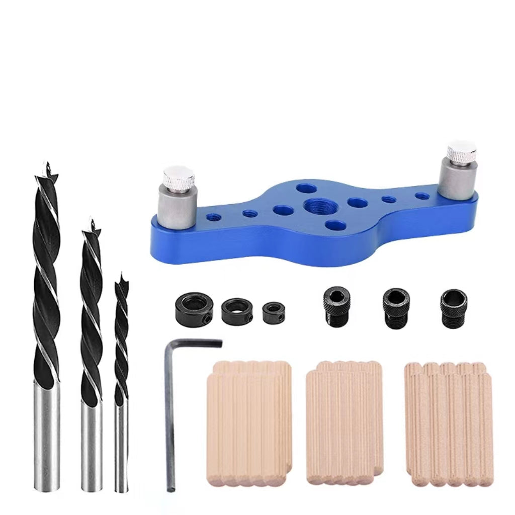 Package includes: 1 x wood drilling fixture. 3 x drill guide rod (6/8/10mm). 7-bit setting. 30 x wooden dowels.