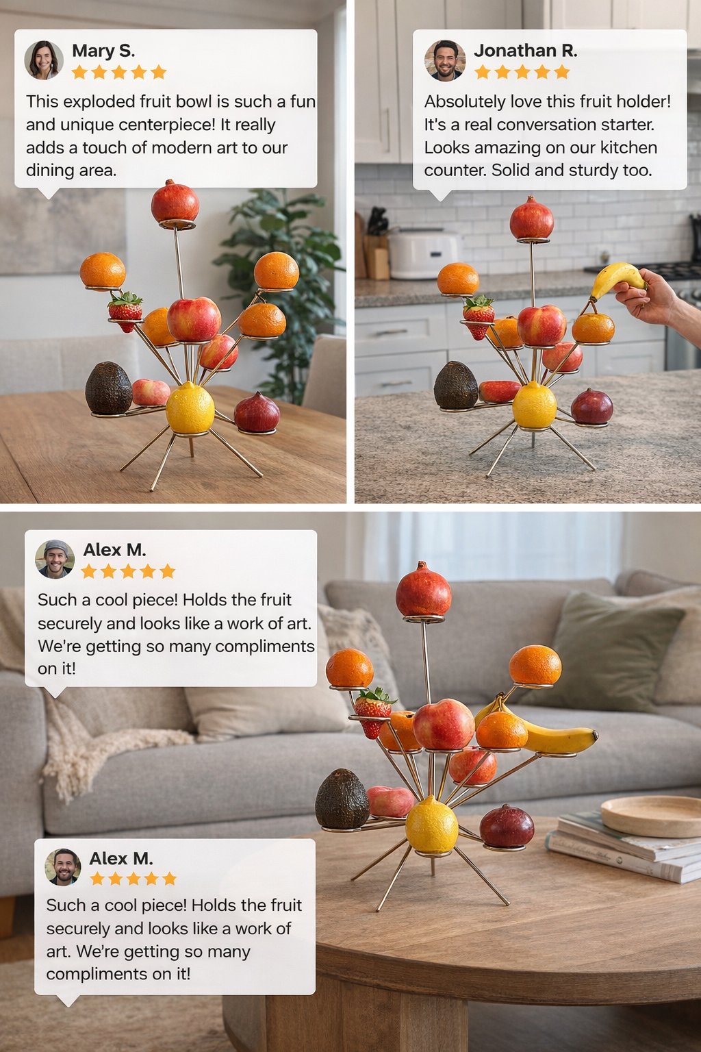 With minimalist lines, it captures the tension of that moment, as if time itself had been paused. Fruits no longer crowd together, but instead gracefully float in mid-air. Placed upon the table, it transcends mere functionality to become a stunning contemporary sculptural masterpiece. 🎨